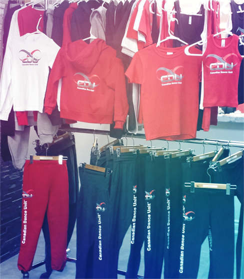 Canadian Dance Unit purchased samples of their studio-wear, in each size. Two weeks later they received their imprinted samples from Studio Love, and displayed them in their front foyer (pictured). The students were given two weeks to try on the samples and place their orders, totalling over 400 pieces! Two weeks later the students had their final products, and CDU enjoyed an 80% increase in studio-wear revenue.